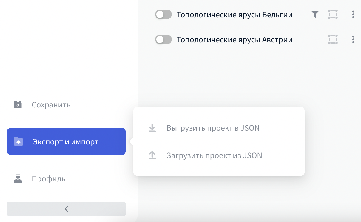 Вы можете сохранить данные в настроенных стилях отображения и других параметрах карты в формате json, выбрав соответствующую кнопку в меню экспорта и импорта.
