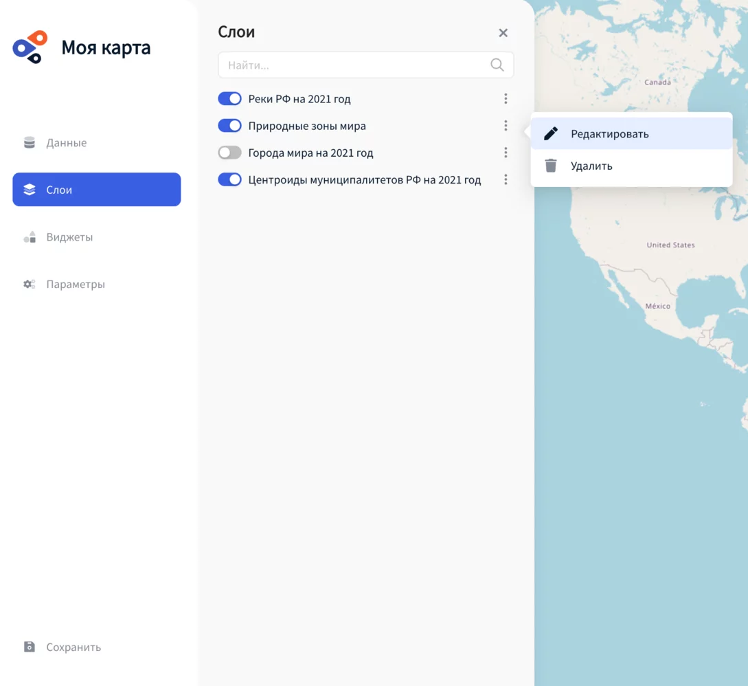 В окне управления слоями вы можете работать с теми данными, которые вы добавили в свой проект.