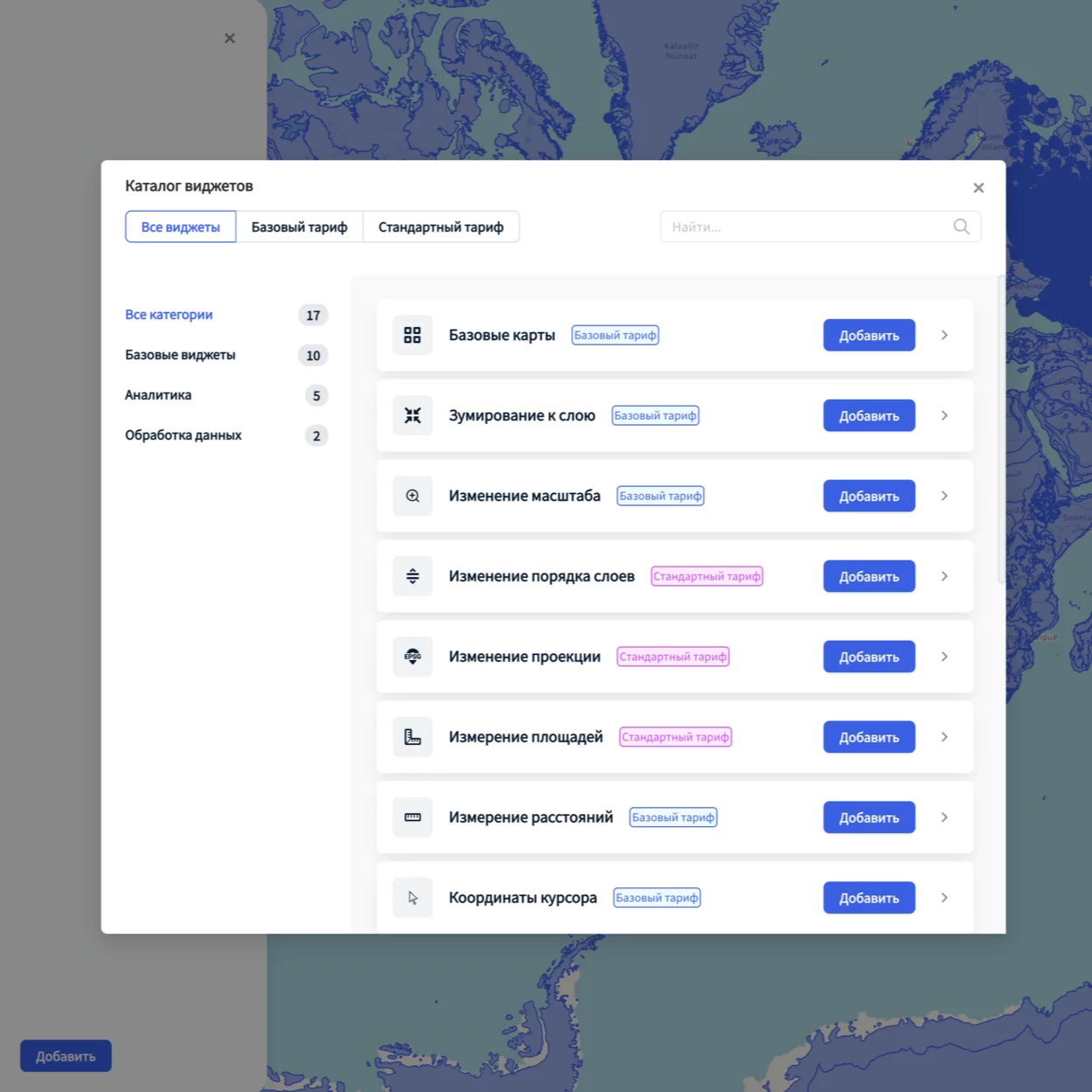 Кликнув на кнопку «Добавить» напротив виджета, вы добавляете его на панель виджетов. Добавленный виджет можно включать / отключать, настраивать или удалять из веб-карты. Подробнее про работу с виджетами см. Раздел 5 - Виджеты.