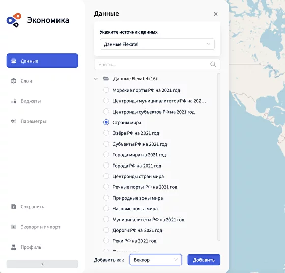 Чтобы добавить данные на веб-карту, необходимо перейти в соответствующий раздел «Данные».