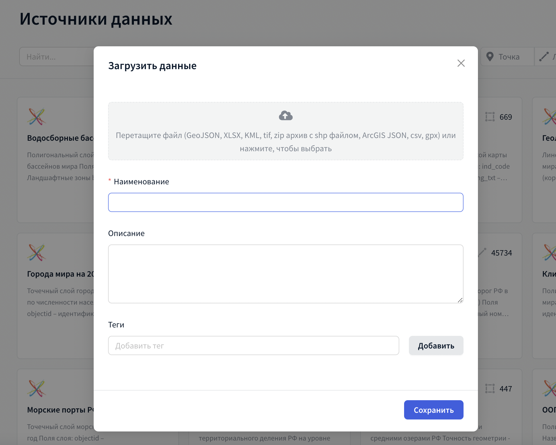 Тэги - возможность добавить тэг для более простого поиска и навигации в каталоге данных. Тэги заполняются через ввод текста и нажатие клавиши Enter