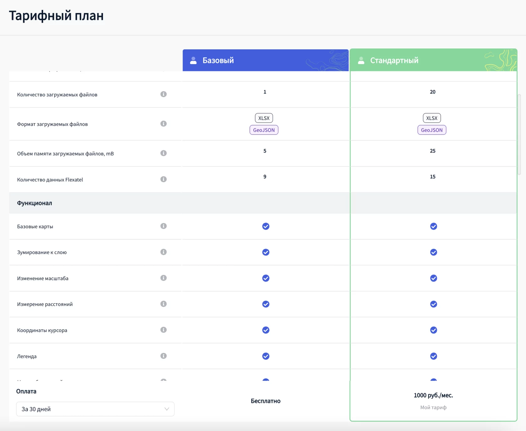 В разделе «Тарифный план» представлены доступные тарифные опции и их подробное описание.