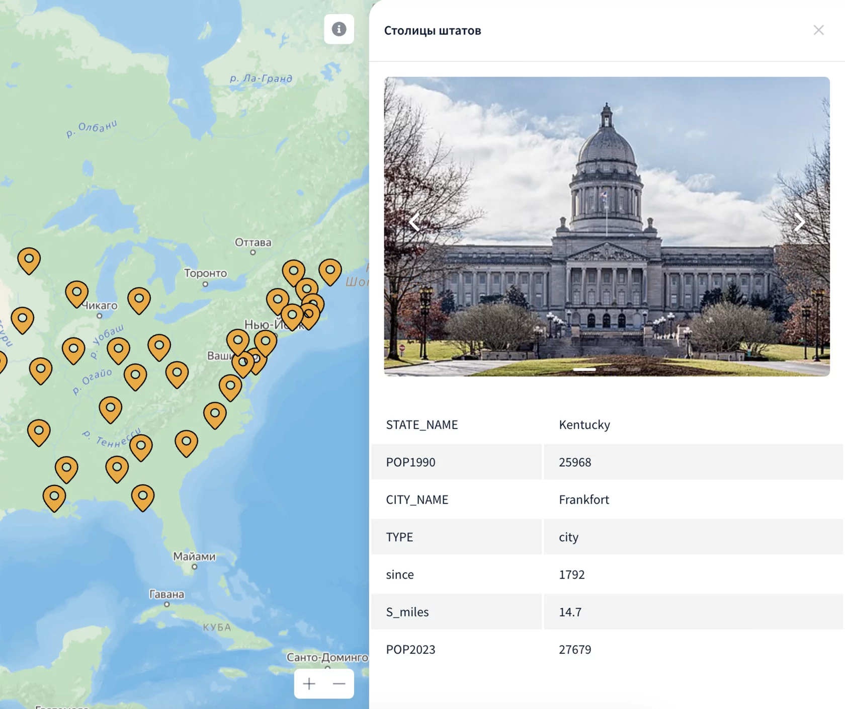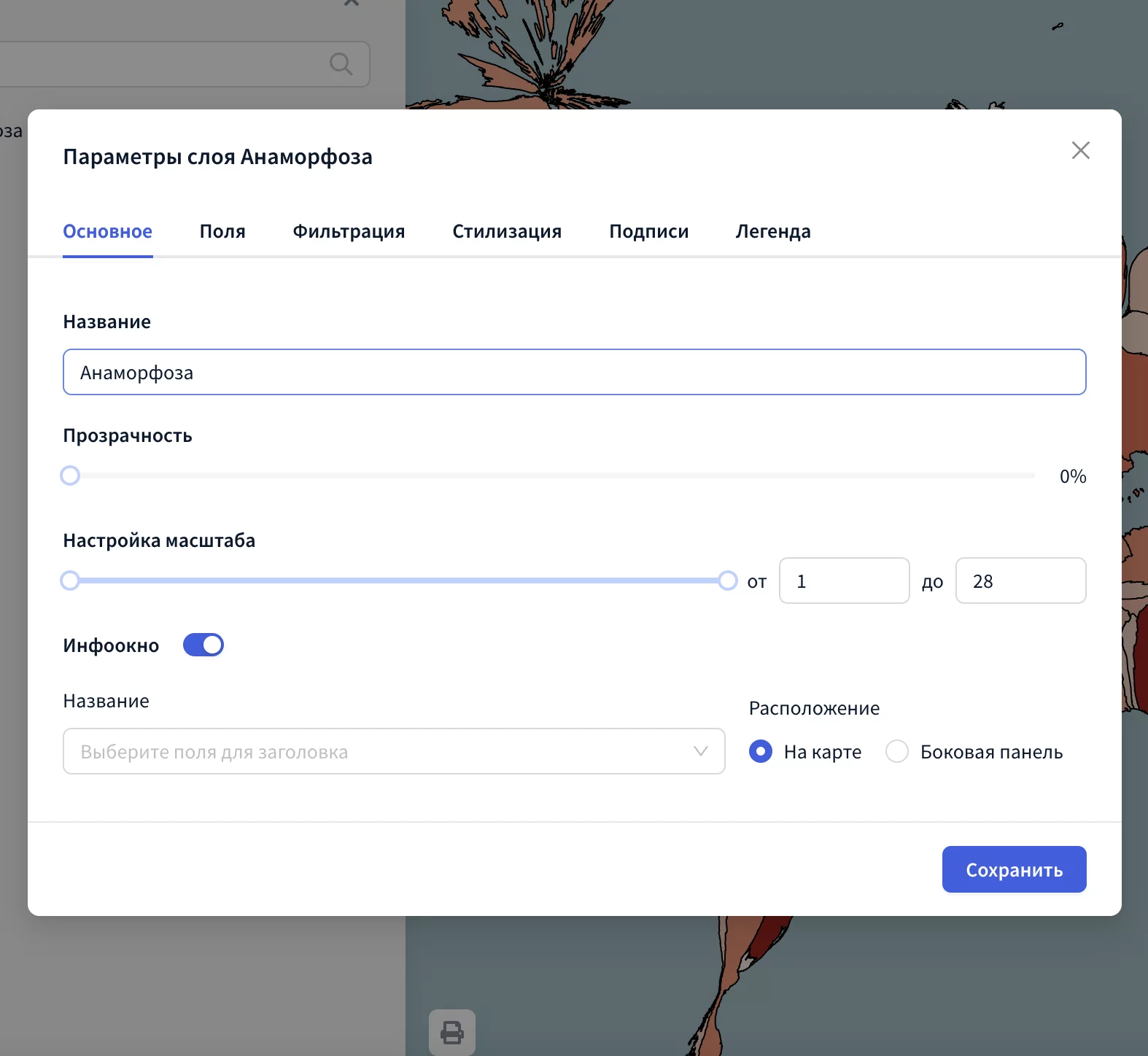 Указать параметры отображения информационного окна (на карте или в боковой панели)