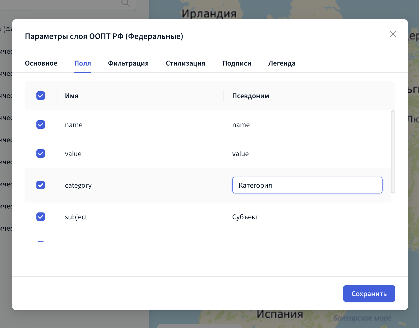 С помощью чекбоксов вы можете отметить те поля, которые будут отображаться в информационном окне, и переименовать их в правом столбце, если это необходимо.
