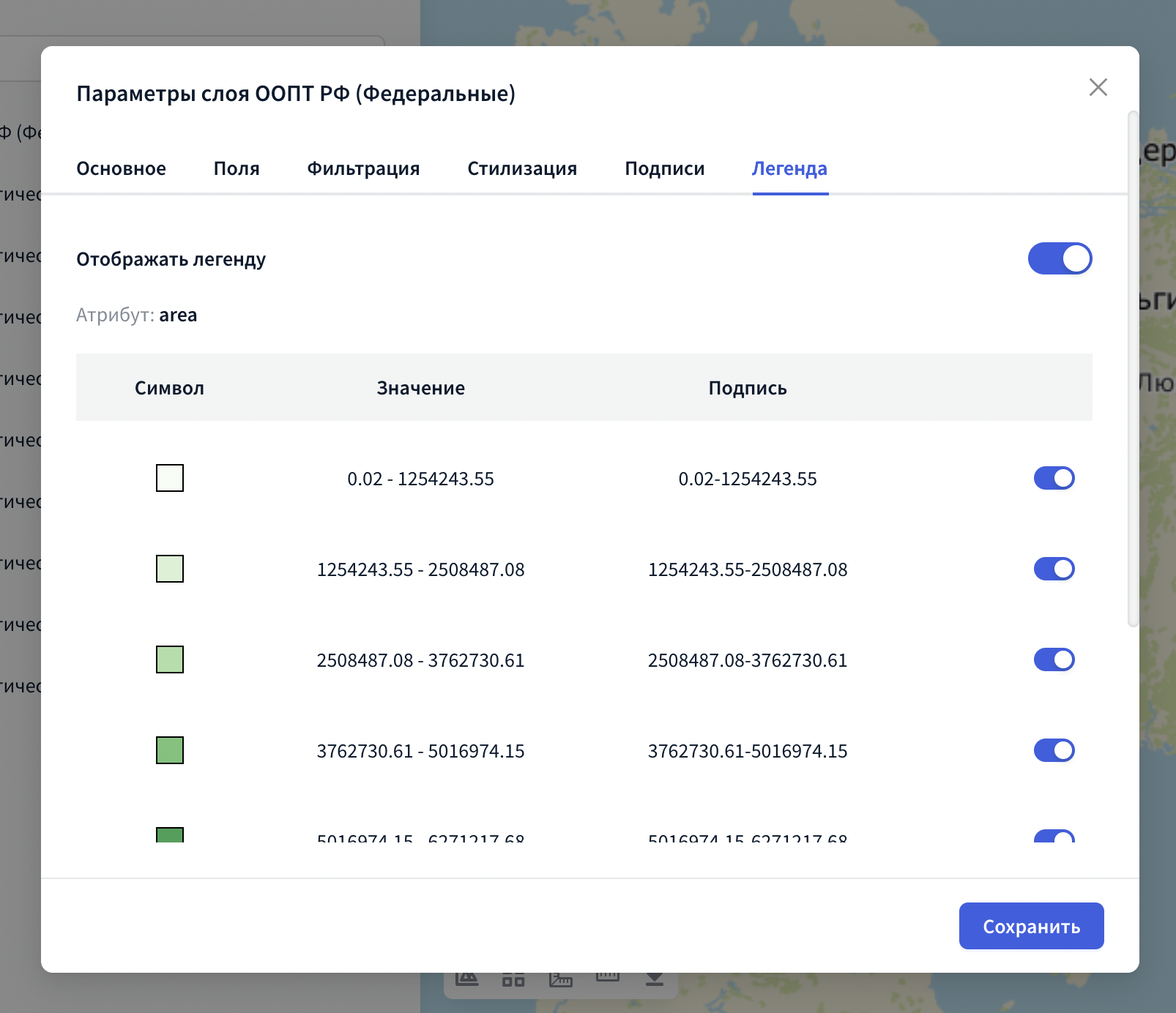 Настройка легенды происходит непосредственно в разделе Стилизация (символы и всевдонимы значений).
