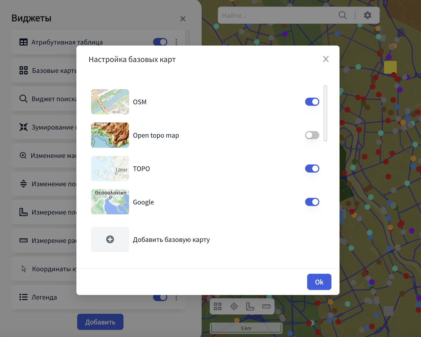 Вы можете выбрать любую подложку из списка и добавить, кликнув на переключатель напротив базовой карты, после чего она будет доступна к выбору при использовании виджета.