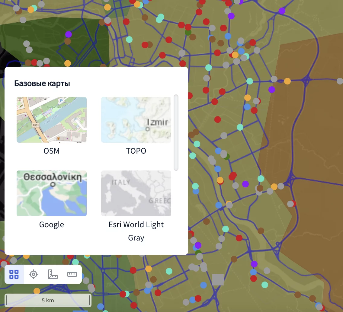В выпадающем диалоговом окне вы увидите доступные для выбора базовые карты (подложки), например: OSM (Open Street Map), Open Topo map, Topo, Google, ESRI World Street Map и пр.