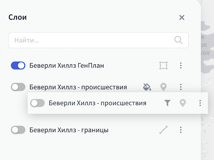 При включении данного виджета конечному пользователю, а также администратору приложения становится возможным изменять порядок слоев на карте.