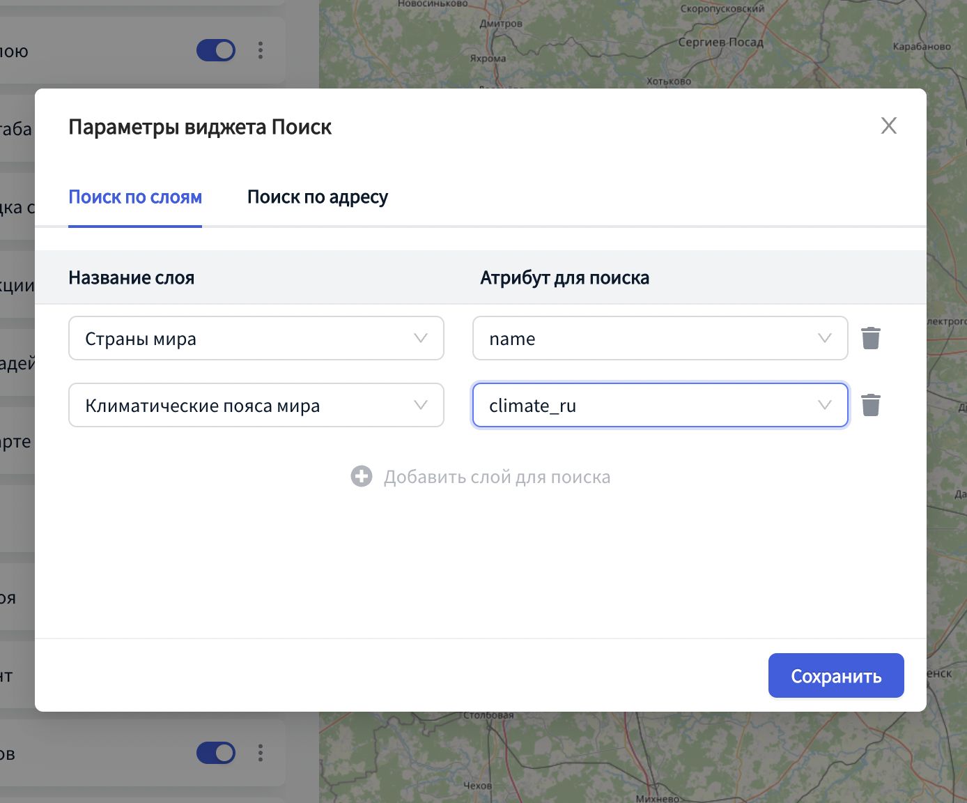 Далее, если вы хотите добавить поиск по объектам слоя - необходимо выбрать вкладку «Поиск по слоям» и в соответствующих выпадающих списках выбрать слои и их атрибуты для поиска.
