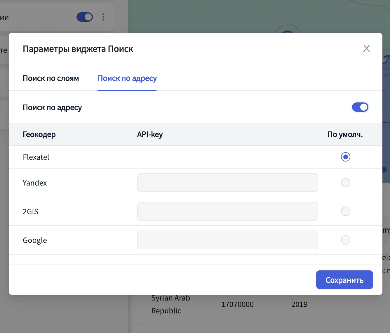 Далее выбрать тот геокодер, который вы хотите использовать (на текущий момент доступен геокодер Flexatel).