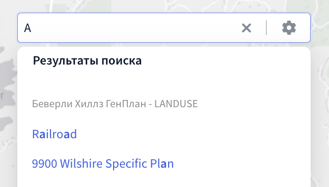 В результатах поиска последовательно сверху вниз отображаются найденные объекты в настроенных слоях или в геокодере.