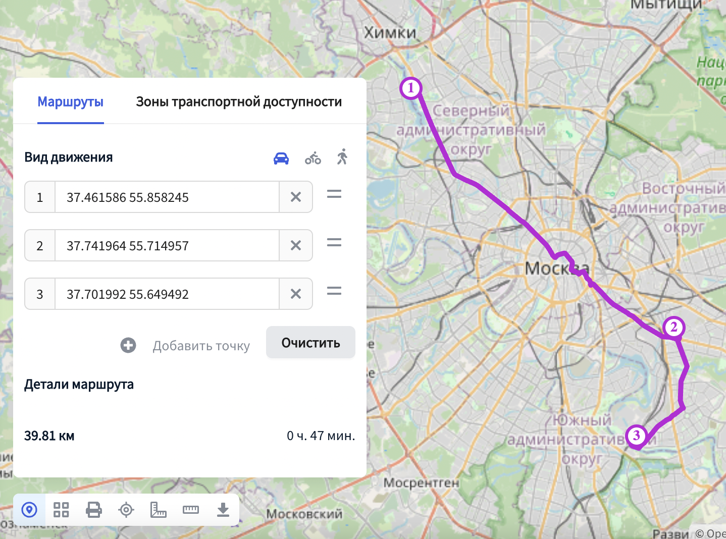 После постановки на карту 2х или более точек маршрута пользователь может выбрать вид движения (автомобиль, велосипед, пешком), на основе которого будет строиться маршрут.