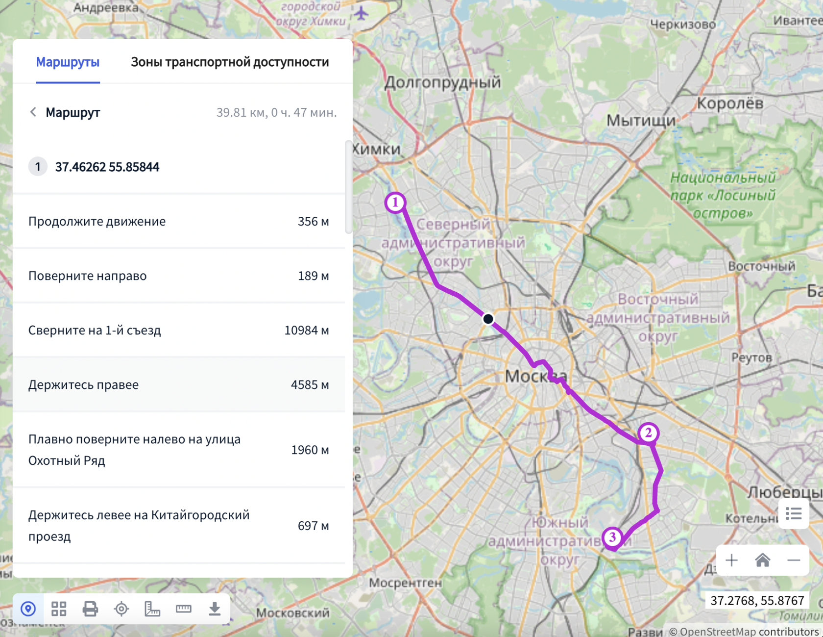Также пользователь может перемещать порядок точек маршрута или просмотреть детали маршрута, нажав на появившийся маршрут.