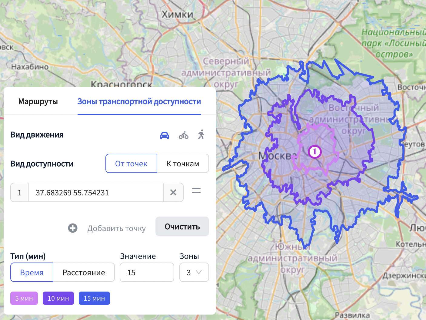 Для того, чтобы построить зоны транспортной доступности, пользователь может перейти в соответствующий раздел и поставить на карте 1 или более точек. После того, как точка поставлена на карте пользователь может менять: